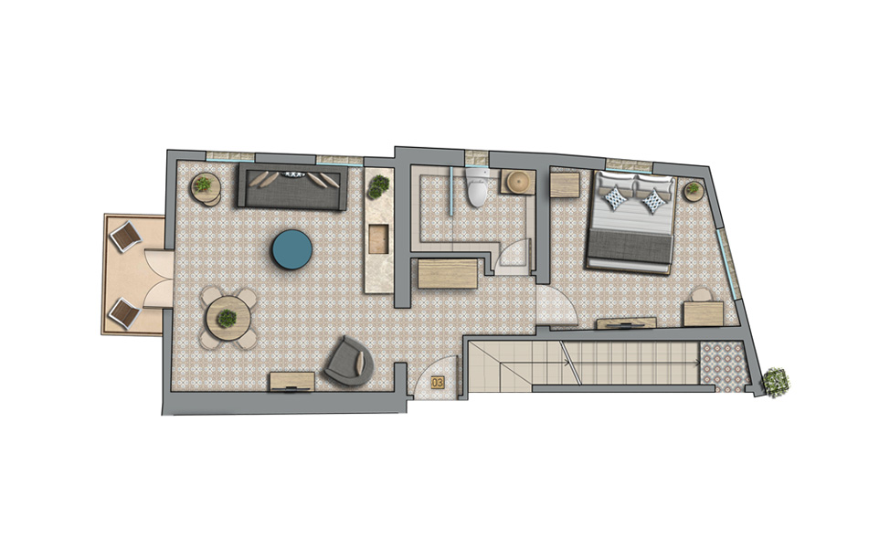 With a master bedroom and living area, this suite easily welcomes up to 4 people, in a stay made even more comfortable by the equipped open-plan kitchen and dining area, along with a balcony that overlooks the glistening waters of the Mediterranean.